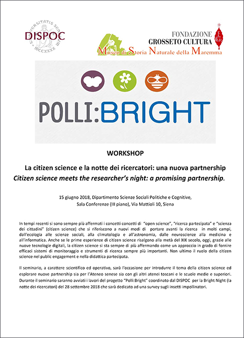 Il seminario, a carattere scientifico ed operativo, sarà l’occasione per introdurre il tema della citizen science ed esplorare nuove partnership sia per l’Ateneo senese sia con gli altri atenei toscani e le scuole medie e superiori. Durante il seminario saranno avviati i lavori del progetto “Polli : Bright” coordinato dal Dipartimento Scienze Sociali Politiche e Cognitive per la Bright Night - Notte dei Ricercatori - , del 28 settembre 2018 che sarà dedicato ad una survey sugli insetti impollinatori.
