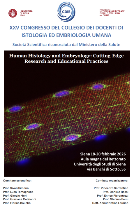L’evento è promosso dal Collegio dei Docenti di Istologia ed Embriologia, riconosciuto come società scientifica dal Ministero della Salute, e dal dipartimento di Medicina molecolare e dello sviluppo dell’Università di Siena.