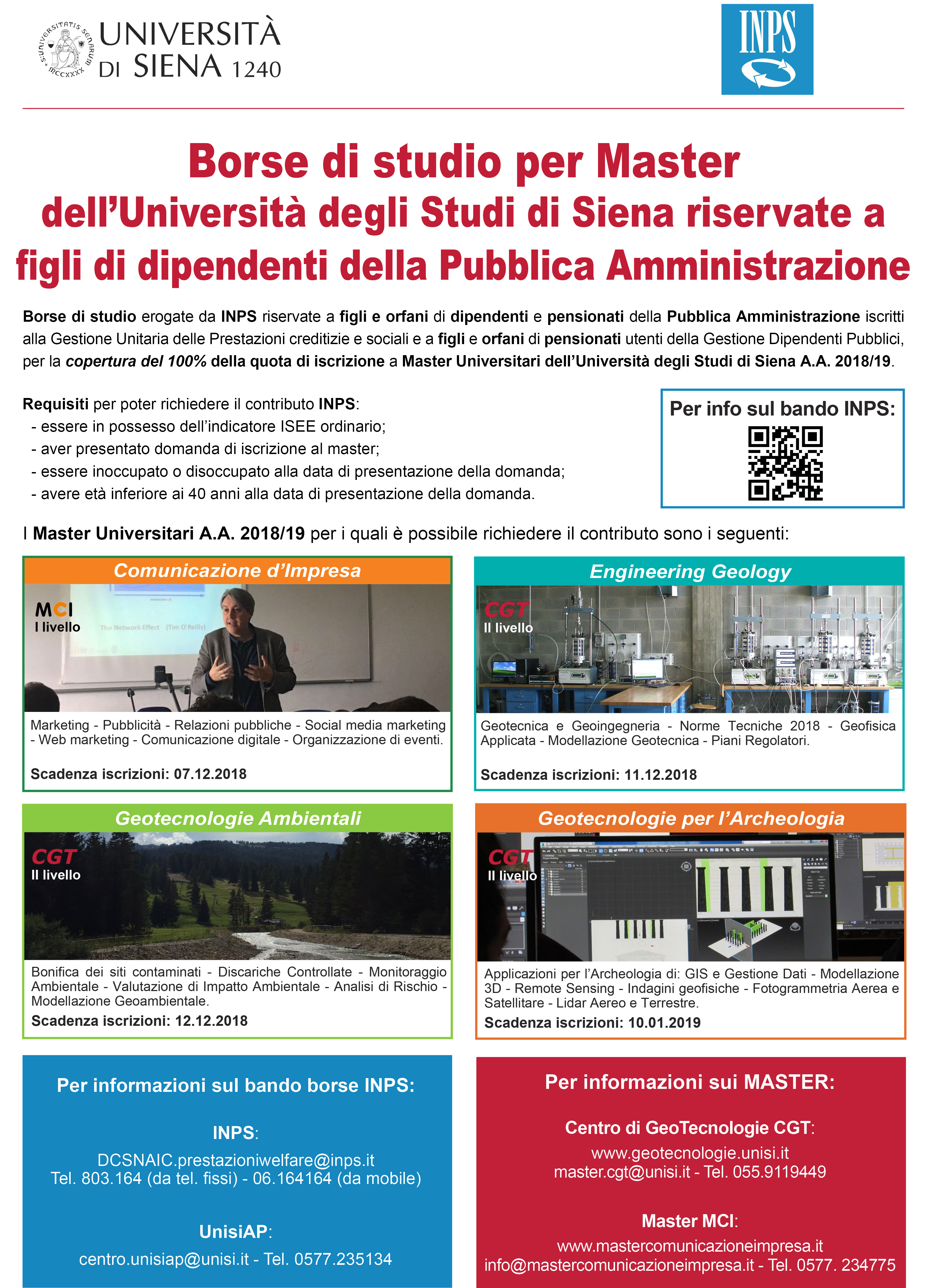 L'INPS mette a disposizione 17 borse di studio riservate ai figli e agli orfani di dipendenti e pensionati della Pubblica amministrazione per iscriversi ad alcuni master dell'Università di Siena.
