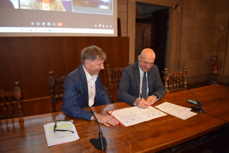 La firma dell’accordo si è tenuta nella Sala delle Lupe di Palazzo Pubblico, fra il Rettore dell’Università di Siena Francesco Frati e il Sindaco del Comune di Siena Luigi De Mossi.