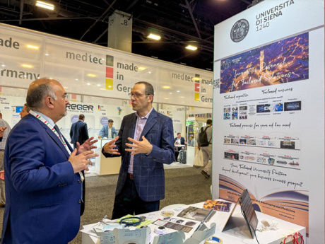 L'Università di Siena, rappresentata dal team di ricerca multidisciplinare guidato dal professor Gabriele Messina del Dipartimento di Medicina Molecolare e dello Sviluppo e dal professor Gabriele Cevenini del Dipartimento di Biotecnologie Mediche, è stata una delle realtà di spicco del Padiglione Italia alla recente Florida International Medical Expo (FIME) di Miami, un evento che ha riunito circa 1300 espositori da 55 Paesi e oltre 13.800 professionisti della filiera life-science. La partecipazione, coordinata da ICE-Agenzia, ha rafforzato il ruolo dell’Ateneo nell’ambito dell’innovazione applicata alla salute.