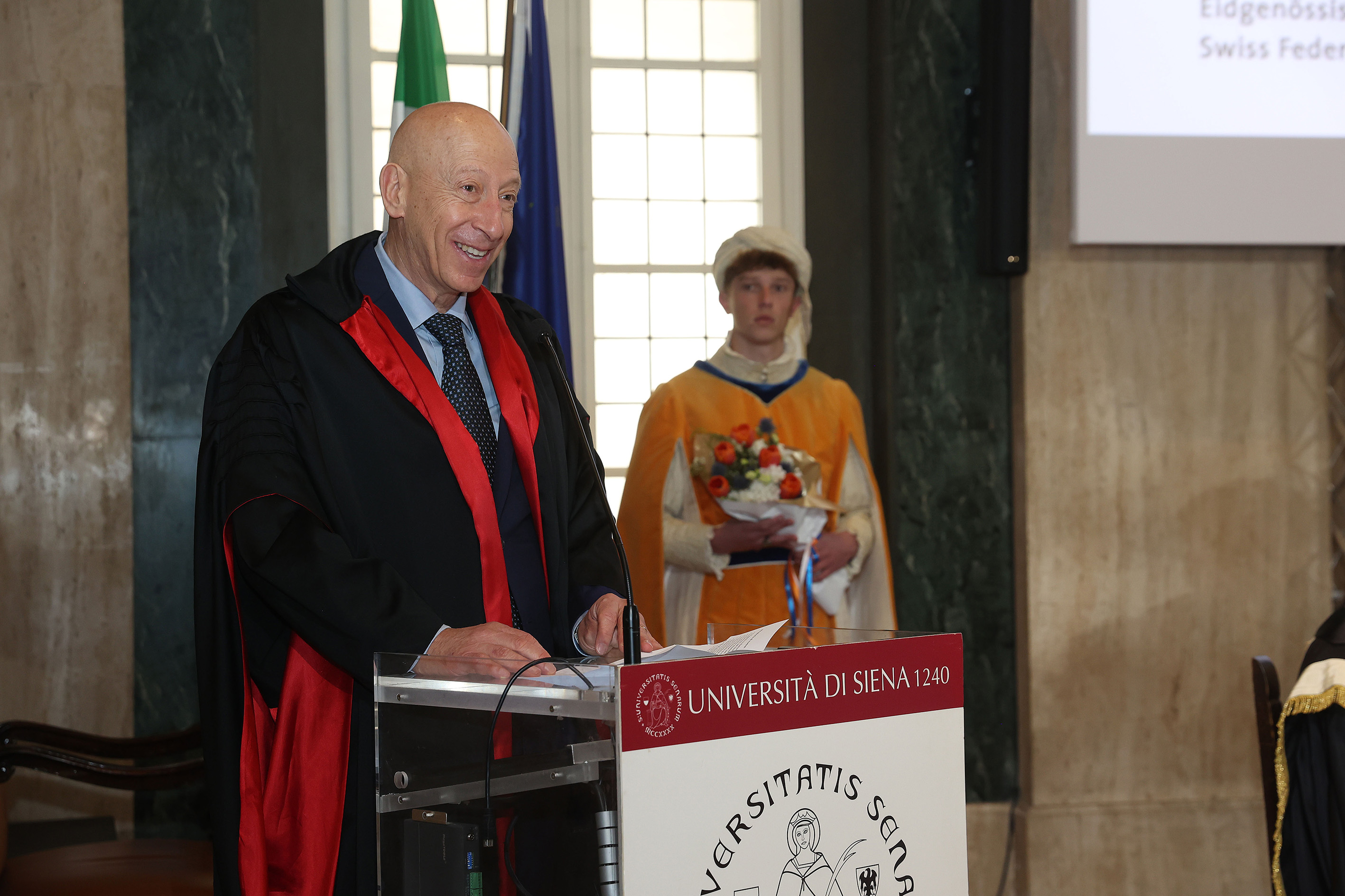 L’Università di Siena ha conferito giovedì 19 marzo 2026, nell’Aula magna del Rettorato, la laurea magistrale ad honorem in Medical Biotechnologies al professor Dario Neri, Amministratore Delegato e Direttore Scientifico di Philogen, riconoscendo in lui una figura esemplare di scienziato e imprenditore che incarna perfettamente il legame tra ricerca accademica d'eccellenza, innovazione biotecnologica e capacità manageriale.